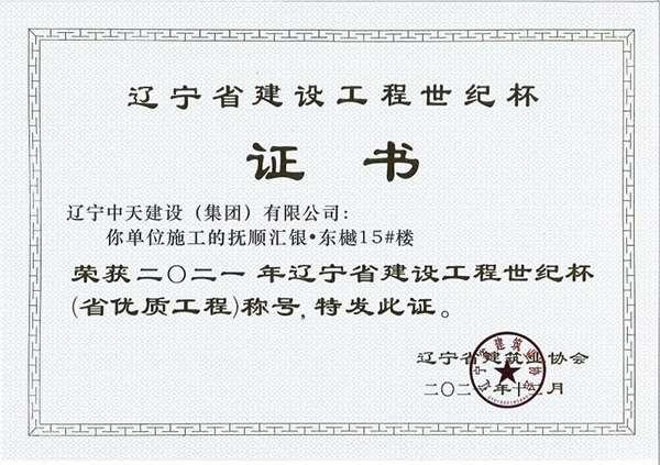 遼寧中天建設(shè)集團(tuán)領(lǐng)導(dǎo)班子認(rèn)真貫徹落實(shí)科學(xué)發(fā)展觀,堅(jiān)持以人為本,積極培育“開拓進(jìn)取,求新向上,求真務(wù)實(shí),團(tuán)結(jié)奉獻(xiàn)”的企業(yè)精神和“干一項(xiàng)工程交一方朋友,占一方市場(chǎng),樹一座豐碑”的經(jīng)營(yíng)理念。經(jīng)過遼寧中天建設(shè)者的辛勤耕耘,許多建筑精品工程象一座座豐碑聳立在撫順大地上,令人矚目。撫順市保障性住房建設(shè)工程榮獲全國優(yōu)質(zhì)工程金獎(jiǎng),撫順移動(dòng)通訊綜合樓、撫順市電信綜合樓、撫順市三寶屯污水處理廠擴(kuò)建及中水回用工程等多項(xiàng)工程獲得“遼寧省世紀(jì)杯工程”、“遼寧市政金杯”工程等殊榮。公司還多次榮獲“省建筑業(yè)質(zhì)量管理先進(jìn)施工企業(yè)”稱號(hào)。
